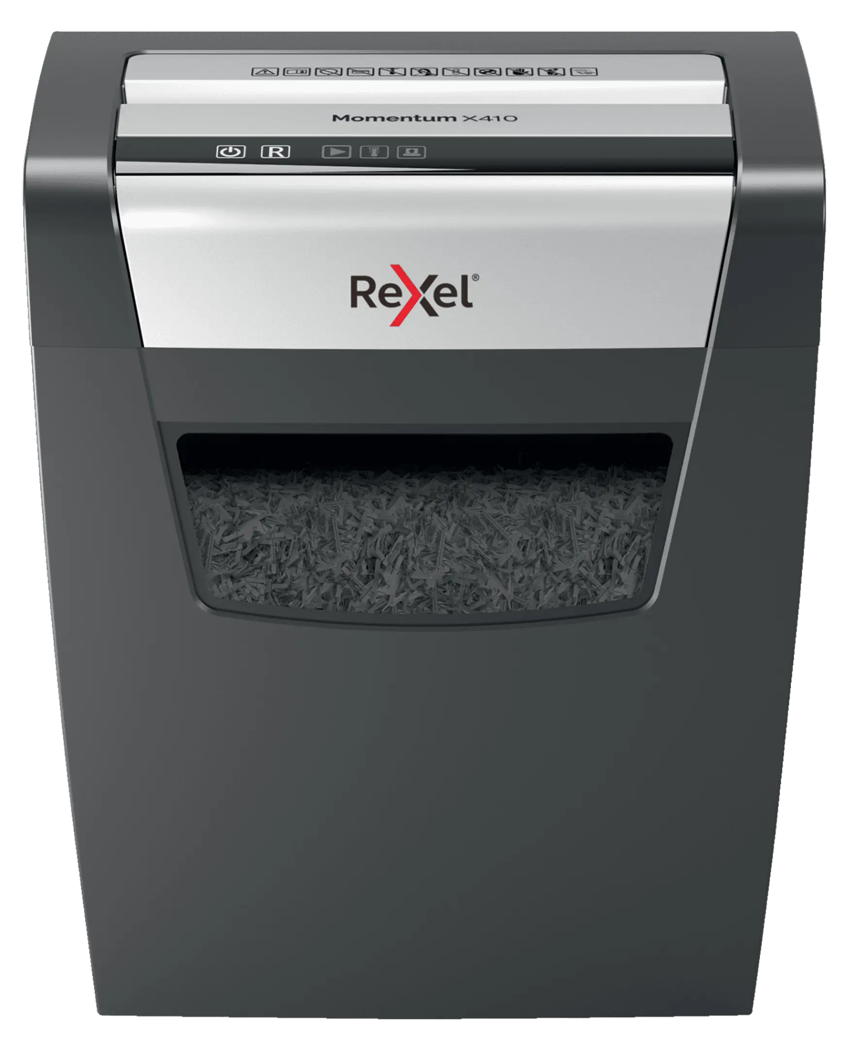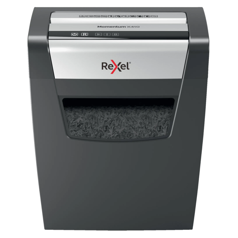 Az erő, mely többre képes! A Rexel Momentum X410 iratmegsemmisítő 10 lapot darabol fel egyszerre 6 perces folyamatos működési idővel. Elsősorban otthoni használatra ajánljuk. Elakadásmentes technológiával és intuitív kezelőfelülettel. P4 biztonsági fokozat, konfetti vágás 4x28mm-es darabokra. 23 literes hulladéktartály. (225db A4-es lap megsemmisítéséhez). Csendes model.